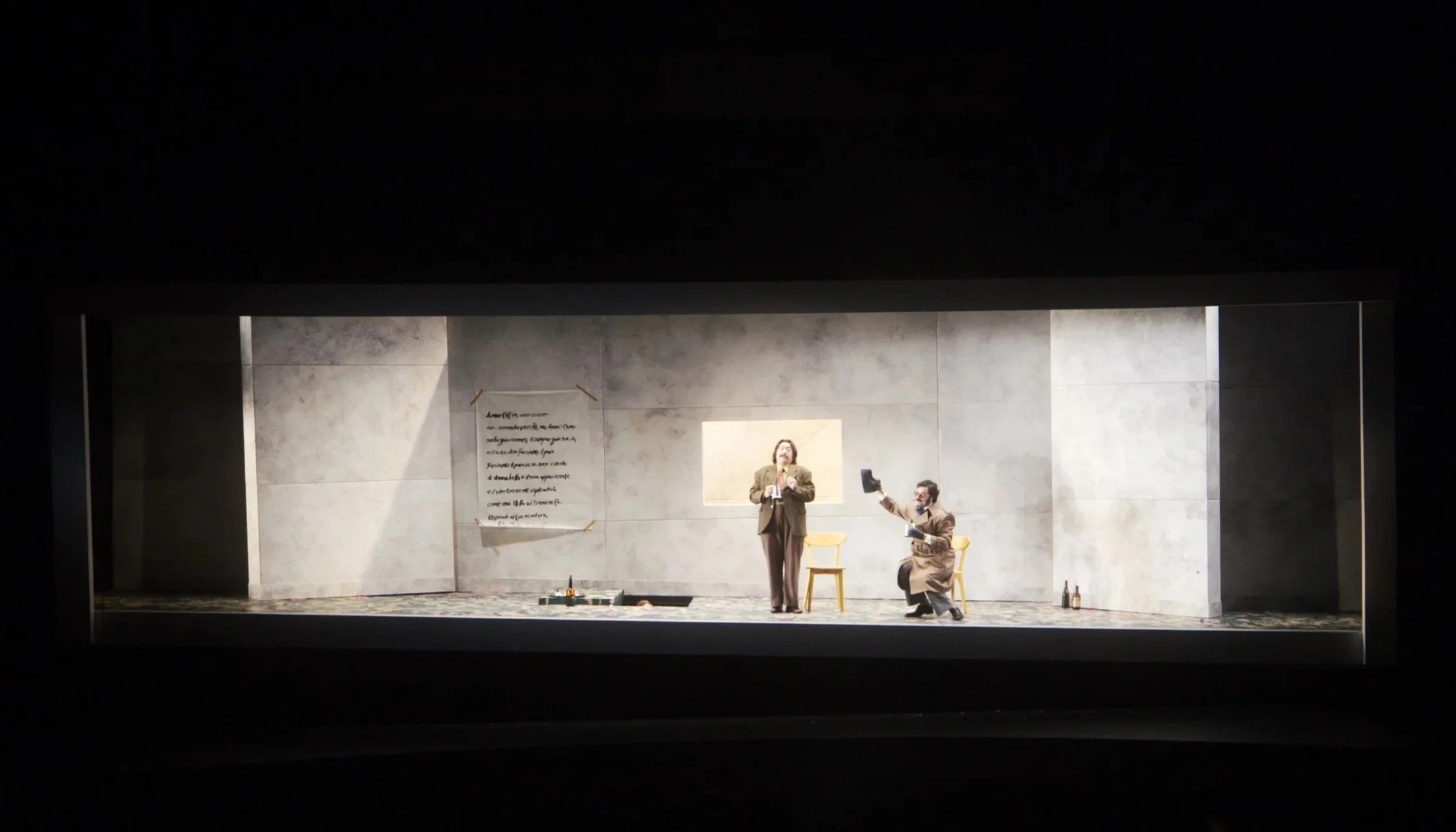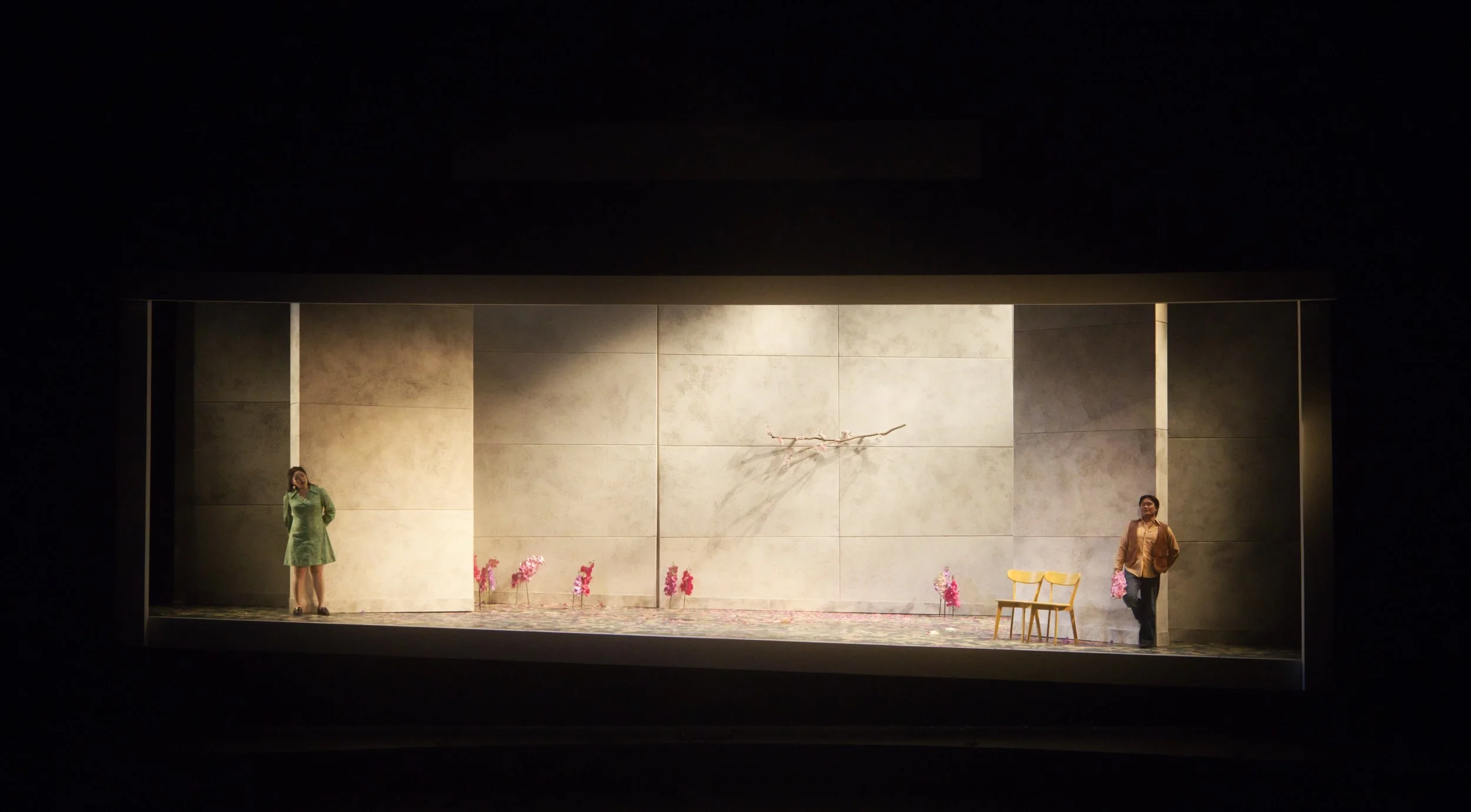 The scenic language is simple: a counter-raked deck with a trap door, eleven walls, two curtains, a set of chairs and tables, and a few additional elements, a flower drop and plastic orchids. It is a limited vocabulary, but one that can move.
